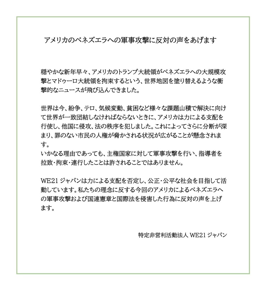 WE21ジャパンこうほくは、WE21ジャパンが1月15日に発出した「アメリカのベネズエラ軍事攻撃への反対のメッセージ」の